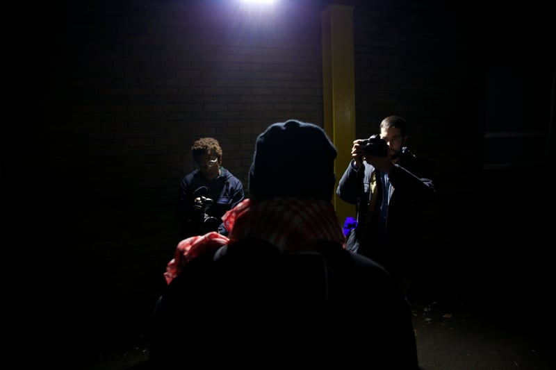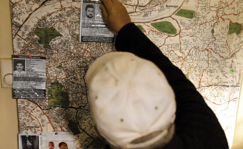 Shariff arranges photographs, depicting the FBI’s most wanted terrorists and other persons of interest, atop a map of Pittsburgh.